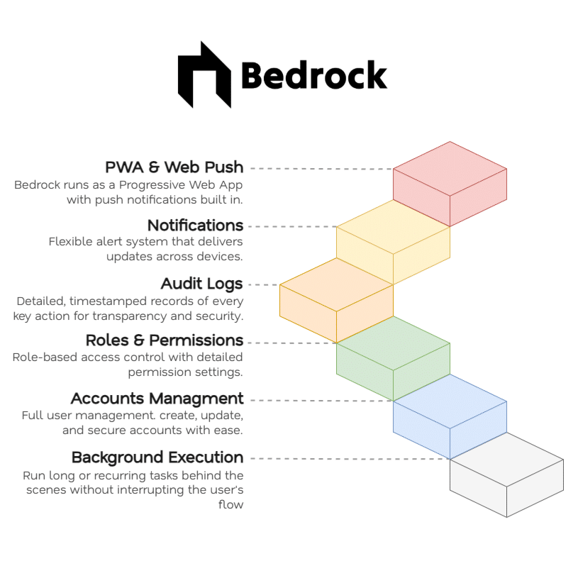 This slows development and creates inconsistencies. Bedrock solves this by providing a solid, scalable framework with all the core features projects need to launch faster and stay secure.